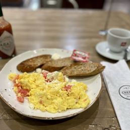I came in early before the rush to a very clean and trendy restaurant. The double espresso was fantastic and the feta cheese and tomato scrambled eggs was quite tasty. It came with sliced multigrain toast and jam which I liked as well. Service was quick and helpful.